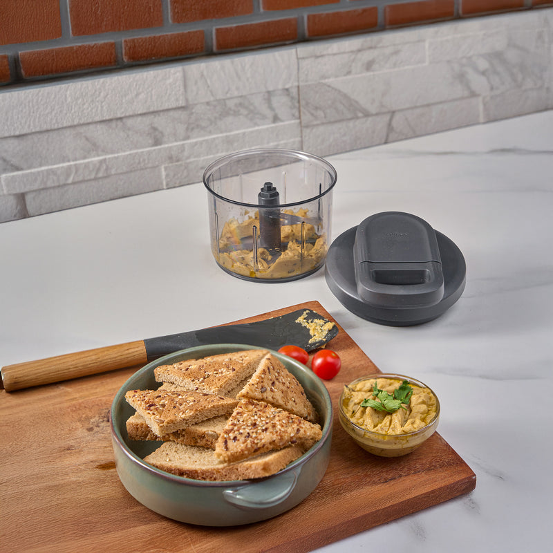 Three sharp, counter-rotating stainless steel blades handle everything from chunky veg to smooth dips.